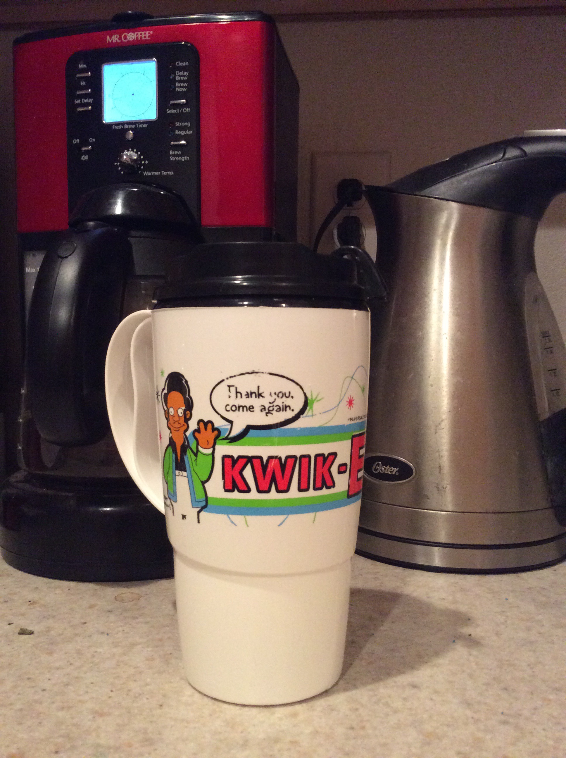 My friend/co-worker Brian got this for me at universal studios, I’m sure it wasn’t cheap. I’m a huge Simpsons fan, this mug is a perfect piece of memorabilia (to go mug from the Kwik-E-Mart)